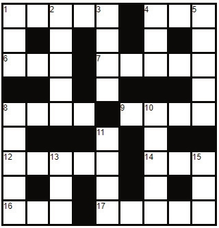Across 1. Measuring stick 4. Heavy mist 6. 5th month 7. Primitive aquatic plants 8. Not female 9. Woof 12. Maker of peanut butter cups 14. Help 16. Affirmative 17. Having texture of sand Down 1. Male sheep 2. Faithful 3. Not fake 4. A fruit 5. From Greece 8. Wed 10. Repeated another time 11. Untidy 13. Belonging to Ed 15. Not night |