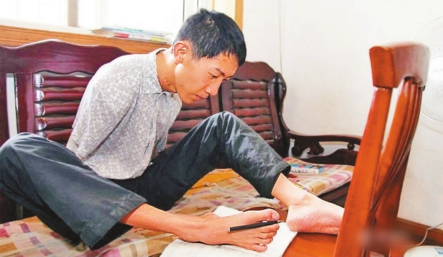 Recently, Tongji University arranged a heart-warming written examination area for a postgraduate candidate Peng Chao, who is armless and has to write with his foot — with a special “desk” to ensure he can complete the exam. The young man was later admitted to the university’s Law School with high scores in preliminary exam, retrial, and interview. Peng lost his arms when playing with his friend at the age of 6. They wandered too close to a nearby high-voltage power line and Peng received a life-threatening electric shock. After five surgeries, doctors were able to save his life — at the cost of amputating both of his arms. Although it was a hard journey, now the 26-year-old Peng has learned to do everything with his feet: eating, drinking, studying, and even gaming. On the morning of March 27, Peng approached the teachers at Tongji Law School asking for “two hard chairs.” Learning of his challenges, leaders of the Graduate School of Tongji University believed it was necessary to provide services for this special candidate to make sure that he could successfully finish the exam. Therefore, Tongji University specifically found two wooden stools and a plank for Peng, installing them as a special desk in the examination classroom. Having completed all the exams in the same time as other candidates, Peng successfully acquired the offer. “I’m so thankful to the teachers of Tongji, they were so considerate when I came to take the test,” he said. For undergraduate studies, Peng was admitted to Sichuan University Law School with a total score of 608 in the National College Entrance Examination. The self-motivated young man also loves poetry, and has participated in Chinese poetry competitions several times. He is also a fervent “League of Legends” fan. “Although there’re some inconveniences, I still want to keep up with the pace of everyone else, and do what others can do,” he said. “I always have a belief in my heart: I can do it, as long as I make greater efforts!” (China Daily) |
