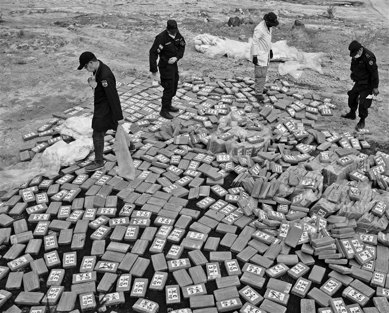 Police officers arrange drug packages, part of a seizure of 1.4 tons of cocaine in the high seas by Salvadoran Naval Force, to be burned in Ilopango, El Salvador, on Tuesday. Reuters via Xinhua