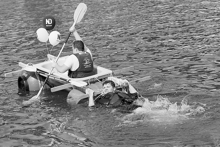 Participants attend the International Bathtub Regatta on the Meuse River in Dinant, Belgium, on Sunday. Starting in 1982, participants vie to create the most impressive bathtub-based craft and compete in the 1-km regatta down the Meuse River in Dinant on Aug. 15 each year. This year’s event has been downsized due to the COVID-19 pandemic. Xinhua |