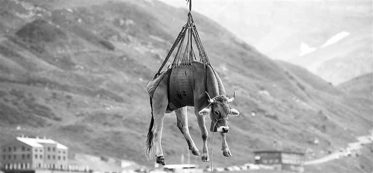 COWS in Switzerland have been airlifted to the bottom of their Alpine meadows in a bizarre spectacle. Around 10 of the animals were taken by helicopter off the ridges in the Klausenpass region in the center of the country. Using a mesh harness, the creatures were suspended by a length of cable below the chopper as they took to the skies. Waiting farmers used guide ropes to help bring the cows to land safely, before moving them into more conventional trailers. Meanwhile, the more fit and able livestock made their way down the mountainside by hoof. Farmer Jonas Arnold said: “One reason for the helicopter transport is that you can’t reach some pastures by car, and the other is that some cows are injured, so they don’t have to walk all the way down.” He added: “I didn’t ask a cow how it feels after such a flight as it couldn’t answer, but it’s only a short distance and it has to keep going. “It was only a short calm flight. I didn’t notice any difference between the ones that flew and the ones that walked normally.” In total, the herd numbers around 1,000 — so only 1 percent of the group were given some help getting down. They are heading to Urnerboden in Switzerland, and are gearing up for the annual cow parade there. (SD-Agencies) |