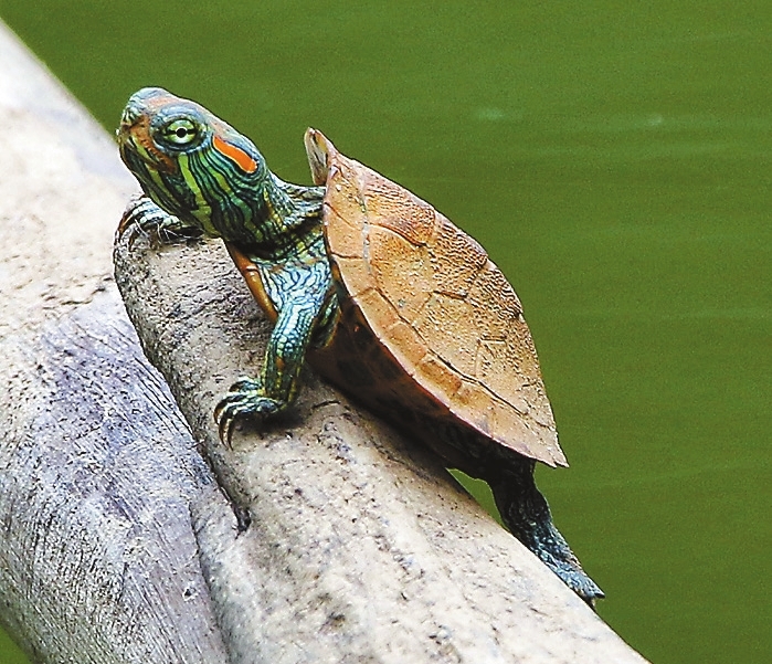 We all have seen pond turtles (Trachemys scripta) at least once in our lives, whether it is in a river, a lake or a pond, or, sadly, being sold on street markets as if they were toys or a silly souvenir. These fabulous animals are characterized by a striking orange stain on the sides of its oval head, with a pointy snout. The carapace (upper shell) is greenish to brownish; it also bears a beautiful set of yellow lines with attractive patterns on it. Females are bigger than males and can grow up to 30 cm long, able to survive both in water and on land. A female slider can lay up to four clutches a year; each clutch can have up to 10 or more eggs at a time. When turtles hatch, they are very vulnerable due to their small size, restricted diet and softer carapaces; however, as an introduced species they have a better chance to survive. Pond sliders are not supposed to be part of our landscape. This species, sought after for its particular beauty, is native to the United States and was later introduced to the entire world due to an endless circle of animal trafficking. As an introduced species, pond sliders are not creating a positive impact on our environment. They compete for resources with the local species and even displace them, feeding on almost everything they can find and taking advantage of not having natural predators here. Juvenile pond sliders are basically carnivores, feeding on insects of all kinds, little fish and sometimes dead animals. In adulthood, with changes in their physiology, they become omnivores, also feeding on plants and therefore expand their chances of survival. When we feel like doing the right thing and release an animal into wilderness, we are actually doing harm. We release an unprepared animal into an unprepared ecosystem. The best we can do to help these little fellas is to stop buying them as pets and to teach others not to do so — until one day, stores will have to give up selling them. It seems like an impossible task, but we can always afford dreaming about a better future. 2021.05.01 A pond slider is seen on a tree branch by a lake in Bijia Hill Park, Futian District. |