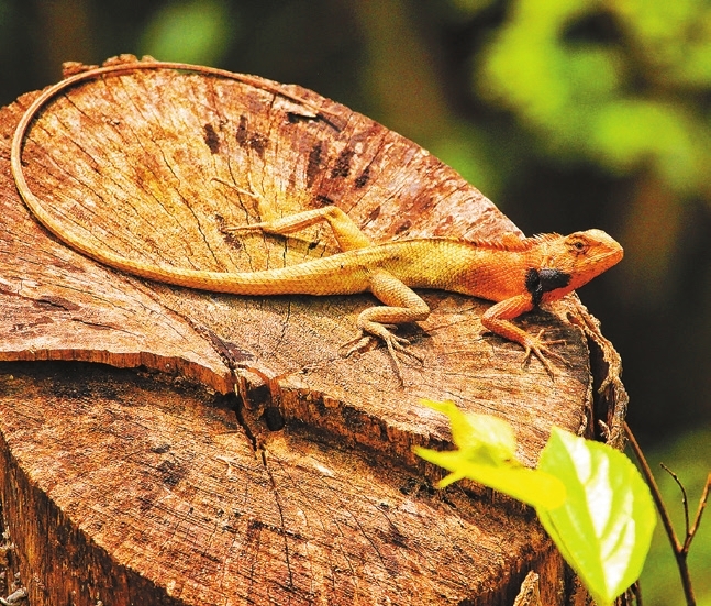One little friend you can always observe around the city parks is the Oriental garden lizard (Calotes versicolor). This fantastic creature is known by many names, including changeable lizard or bloodsucker due to its striking red coloration during its reproductive season. The garden lizard can have different colorations and oftentimes people may think they have come upon a completely different animal when they are actually meeting an old friend. Its colors may vary from green, gray, red, brown or even whitish. They are not too big in size, measuring around 25 to 40cm from nose to tail. The newborns are as short as 3 centimeters. Males and females look a bit different, basically in terms of the length of their tails. The males display a red coloration during the breeding season, when their crests turn into a striking crown of spines. These beautiful lizards are often perched in small trees or bushes throughout the city and they tend to stay still, waiting for their prey to pass in front of them. They feed on a wide range of smaller animals that include insects, annelids, mollusks, amphibians, reptiles or even small birds, and in some cases, they can end up eating their own youngsters. One of the coolest facts about the bloodsuckers is that they lack sexual chromosomes, making them basically born as females and developing into males due to an increase in the sex hormone testosterone. Females can lay three to more than 20 eggs per clutch during spring and autumn, depending on the size of the female. Garden lizards are important for controlling other animal populations, but they also need to be controlled, because they are voracious predators that could easily decimate an entire population of other species by eating them all. They also compete for resources against other kinds of lizards. 2020.04.25 An Oriental garden lizard rests on a stump in OCT Wetland Park in Nanshan District. |