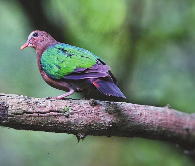 One of the rarest species you can find in Shenzhen is the emerald dove (Chalcophaps indica), that is, if you have keen eyesight, because they are really difficult to spot due to their camouflage colors that blend perfectly with the ground cover where they live. The Asian emerald doves are beautiful indeed, their face garnished with a striking silver cap that draws a fabulous line over the eyes and back to the head. And their wing’s feathers are emerald green, sometimes also adorned by a white layer on the top. The beak is red and the neck is brown; the tip of the back feathers is blackish. Altogether it brings a fantastic combination of colors that are extremely pleasant to observe. These amazing birds are usually loners or sometimes observed as couples, which is another reason why it’s not too easy to find them. They usually remain on the ground foraging for fruit, small plants and seeds and prefer dense forests. In urban areas of the city, Bijiashan makes a perfect home to one couple. The green doves don’t lay many eggs, mostly just one or two, and it is common that only one of the hatchlings survives, as the newborns are not very strong. Being blind, naked and very weak, they require strong parental care that both parents are responsible for from the moment of incubation. They take about two weeks to be ready to fly. When fully grown, they reach a length of about 25 centimeters. As sad as it may sound, the biggest threat to emerald doves are humans. As people like to keep the beautiful birds in cages as pets, their illegal trafficking is common. Also, because of habitat loss, the species is scattered to places where survival can be easier. Although a rare sight in parks of the city, the species is not considered endangered, for there are plenty of them in their habitats in the wilderness. 2021.05.30 A common emerald dove perches on a branch in Bijia Hill Park in Futian District. |
