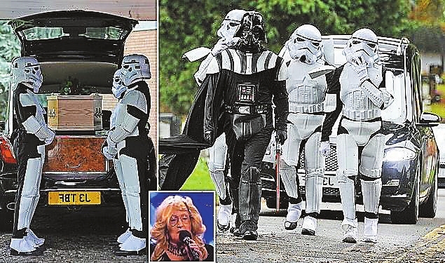 A BRITISHWOMAN had one final wish for her funeral — she wanted to be escorted in the cemetery by Darth Vader and stormtroopers. Brenda Morris, 78, had her final wish come true. Originally, she had planned to donate her body to science but that couldn’t happen so the former chemistry teacher had the request for the workers at the Thomas Brothers funeral home in Redditch. Funeral director Mark Thomas bought the Darth Vader and stormtrooper costumes online and they wore them to escort Morris on her final trip. She didn’t want the procession to meander through the streets, so instead she had instructed Thomas to get her “fast down the highway.” Thomas said they stuck to the speed limit, but the normally, slow trip was done in about two minutes. Thomas and his stormtroopers practiced before they took Morris to the crematorium. Morris was also known for her appearance on “The X Factor” in 2010, where she performed Pink’s “So What.” (SD-Agencies) |