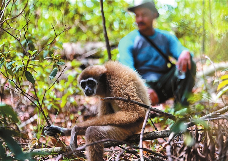 A man observes a gibbon after the animal was released to the wild in Aceh, Indonesia, on Saturday. Xinhua