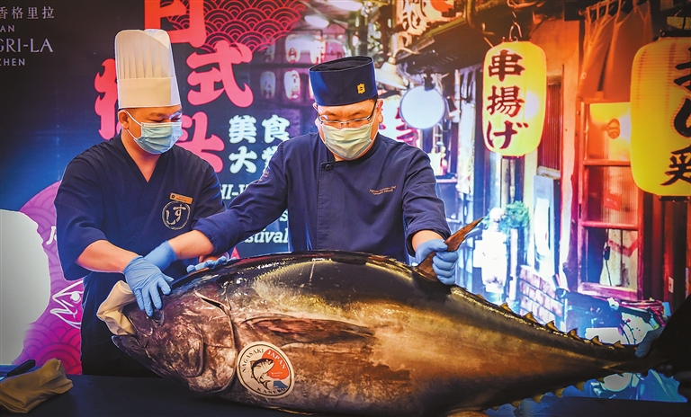 FUTIAN Shangri-La, Shenzhen is presenting an authentic Japanese street food buffet dinner at the Café Zen all-day dining restaurant through Nov. 30. The hotel has invited Japanese guest chef Hiroaki Karasawa, who works together with the restaurant’s culinary team to offer Japanese street food specialties and takes guests on a fantastic gourmet tour to Japan without stepping away from the city. Karasawa is the executive chef of the Shangri-La Group’s culinary R&D center and has over 33 years of Japanese culinary work experience. In 2001, he joined Nadaman, a Japanese restaurant brand founded in 1830. Adhering to Nadaman’s high standards for traditional Japanese culinary arts and the use of seasonal and fresh hand-picked ingredients, Karasawa is widely recognized, and his culinary career with Nadaman has taken him around the world to different cities including Tokyo, Kuala Lumpur and Beijing. Karasawa uses fresh and seasonal ingredients and cooks in a traditional yet creative style. At the food festival, sushi of a rich variety, Japanese robatayaki, hot dishes, desserts and unlimited Asahi beer will surely awaken one’s taste buds. The Japanese street food festival at Futian Shangri-La, Shenzhen kicked off last Friday with a theatrical tuna cutting show, traditional Japanese dance performances and a sake opening. Guests appreciated not only the chef’s superb cutting skills, but also the culinary culture of Japan. Guests are also invited to Café Zen’s outdoor terrace, which has been transformed into a Japanese food street with various stalls, and explore additional authentic Japanese delicacies: Nagoya-style deep-fried chicken wings, Okinawa “goyachampuru,” shrimp okonomiyaki, sukiyaki pot, and takoyaki octopus ball, among many others.(Tang Li) |