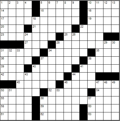 Across 1. Talon 5. Tapestry 10. Wicked 14. Whip 15. Bonds 16. Heredity unit 17. Something that cannot be done 19. Killer whale 20. Cry of disgust 21. Sheriff’s group 22. Moon of Saturn 23. Ostentation 25. Furze 27. Sphere 28. The fringe of a shadow 31. “Holy cow!” 34. Move furtively 35. Uncooked 36. Press 37. A wheeled platform 38. Found on most heads 39. “The Matrix” hero 40. Indistinctly 41. Itty-bitty 42. Conspires 44. Arrive (abbrev.) 45. Goat antelope 46. One sank the Titanic 50. Make fun of 52. Stags 54. Born as 55. Circle fragments 56. Piety 58. Body of water 59. Turf 60. Leave out 61. Existence 62. Aquamarine 63. Diminish Down 1. Precipice 2. Female demon 3. Type of poplar tree 4. Which person? 5. Drink 6. Lift 7. Bones on your sides 8. Supposedly 9. South southeast 10. Self-interest 11. Bones of the spine 12. Ancient Peruvian 13. Low-fat 18. Surplus 22. Not false 24. Thrust with a knife 26. Unique 28. Tablets 29. Shower 30. Askew 31. Brass component 32. Chocolate cookie 33. Bags of wool 34. An indefinite location 37. Prank 38. Parsley or sage 40. Harsh or arduous 41. Seize 43. Renter 44. Defacto 46. Sarcasm 47. Colonic 48. Varnish ingredient 49. Old-fashioned adventure 50. Story 51. Historical periods 53. Affirm 56. Blot 57. At this time |