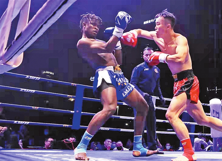 Shenzhen-based Eastern Warring Dragon joined hands with the World Boxing Council and the International Muaythai Council to hold an international boxing event in Nanshan District, Shenzhen, on Saturday, attracting 24 players from China, France, Iran, Thailand, Uzbekistan and Rwanda. (Top) China’s Wang Xiyue (L) and Iran’s Wish in action. Wish won the fight. (Bottom) China’s Husitu (R) and France’s Victor Urie in action. Urie won the competition. Sun Yuchen |