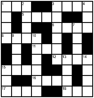 Across 1. Move up and down 3. Long-necked bird 5. Stove 6. Stretched circle 8. What you’re called 11. Ampere (abbr.) 12. 365 days 15. Green or waxed veggie 16. Hearing organs 17. Must have 18. Black sticky substance Down 1. Singe 2. Sonic sound 3. Charlie Brown’s dog 4. Nothing 7. Region 9. Car part to hold wheels 10. Made money from work 13. Not west 14. Lion sound 15. Forbid |