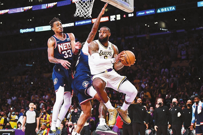 Los Angeles Lakers forward LeBron James (R) passes against Brooklyn Nets forward Nic Claxton (L) during the second half at Crypto.com Arena in the U.S. on Saturday.  LeBron made some holiday history on that day. With his point production against the Brooklyn Nets, James passed Kobe Bryant to become the NBA’s all-time leading scorer on Christmas.  SD-Agencies