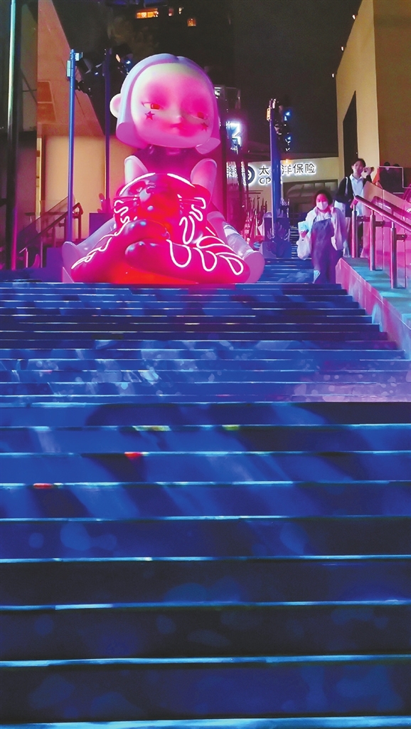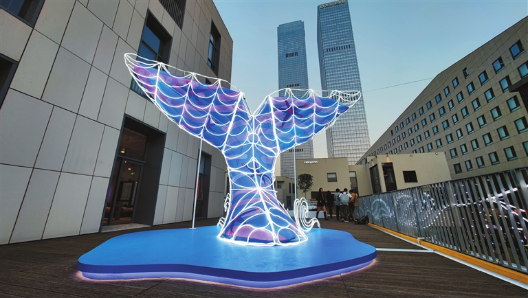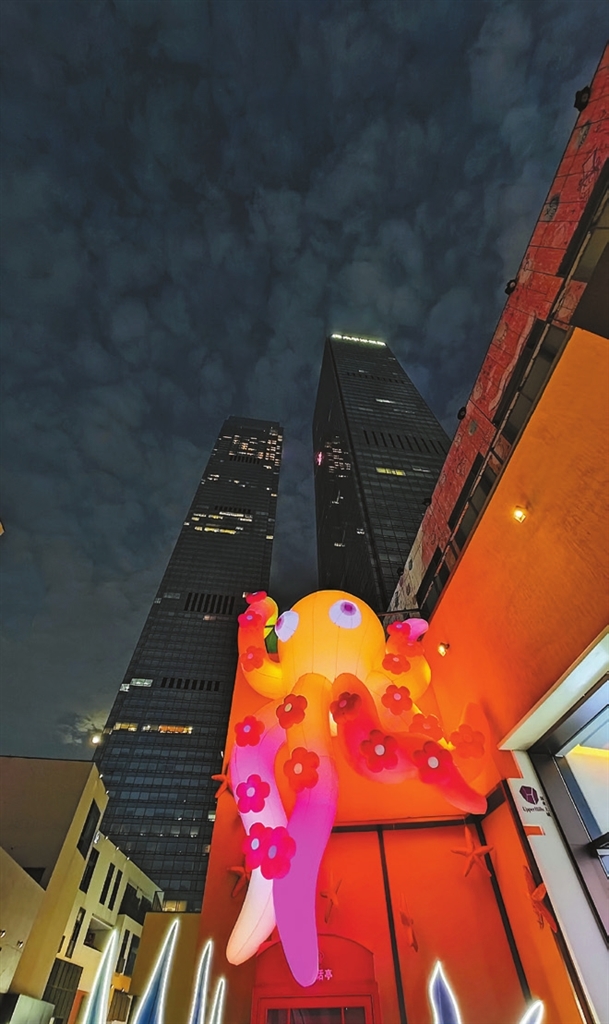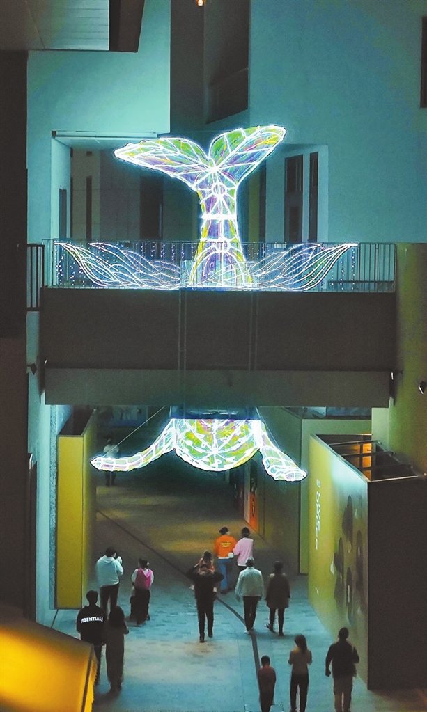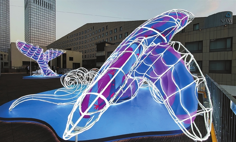 ALTHOUGH the 2021 Shenzhen Design Week at UpperHills wrapped up early this month, locals can enjoy another extravaganza that will last through February. In the daytime, UpperHills is known as a colorful loft town with rows of dinky and picturesque buildings. At night, a light show decorates UpperHills with installations designed by Chinese artist Xu Minqi. The show, with themes on endangered animal protection and ecological balance, features installations shaped as whales, white rhinoceroses, a tiger, an octopus and more. The glowing marine creatures and other light projections not only echo the city’s ocean culture, but also create a joyous and dreamy atmosphere at UpperHills. The recently opened aerial footbridge linking UpperHills, Lianhua Hill and Bijia Hill has made the area a welcome respite from the concrete jungle in the city center. (Cao Zhen) |