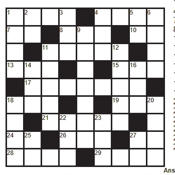 Across 1. Male deer 4. Curved structure 7. Note after so 8. Eastern Standard Time 10. Father 11. Chubby 13. Sheep sound 15. A boy 17. Swimming fin 18. Had eaten 19. Also Known As 21. Cut into cubes 24. Hesitation sound 26. Had eaten 27. 11 in Roman numerals 28. Group playing on same side 29. Cooking fat Down 1. Think broad piece 2. Expression of gratitude 3. Hair styling product 4. Automated Teller Machine 5. Audio disk 6. Not soft 9. Someone under suspicion 11. Faded 12. Earnestly ask for 14. Toward the stern 16. Noah’s boat 18. Encourage 20. Amongst 22. _ __; you are; he is 23. Snake-like fish 25. Regarding (abbr.) 27. Buzz’s robot |