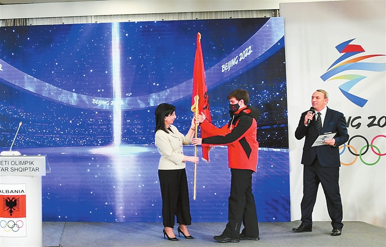 Minister of Education, Sports and Youth Evis Kushi (L) hands the national flag of Albania to skier Deni Xhepa in Tirana, Albania, on Monday. Xhepa, 18, is the only athlete in the seven-member national team. Kushi noted that although the Albanian Government has increased investments in the sports infrastructure in the country, there is still an urgent need for more investments in particular in special sports disciplines such as skiing. Chinese Ambassador to Albania Zhou Ding said that Albania has always been an active participator of the Olympic Games. “I am confident that Deni and the whole team will impress the world again in Beijing, not only by the good performance of skiing but also as a goodwill ambassador,” he said.Xinhua |