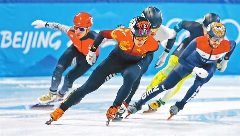 Ren Ziwei (front) of China in action during the men’s 1, 000m short track speed skating final at Capital Indoor Stadium in Beijing yesterday. Ren won the title to give China the second gold medal at the Beijing Winter Olympics. Xinhua