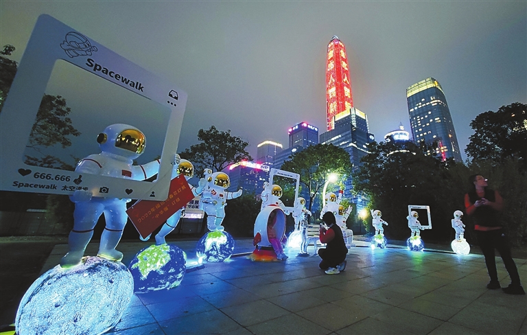 VARIOUS shapes of festival lights ranging from astronauts, tigers, fish, butterflies, swans and crabs adorn Futian District’s Civic Park, Xiangmi Park and Huaqianbei Pedestrian Street until Feb. 20. Civic Park, located in the south square of Civic Center, is the main light show venue that features more diverse designs than the other two venues. An array of astronaut-shaped lights, an expression of Chinese national pride, is one of the most popular installations that passers-by take photos with. Lights showing an adorable kid holding lotus flowers and a big fish symbolize that the fortune and abundance of food we had will continue in the coming year. A fascinating and playful distortion mirror and a clown-shaped light provide children lots of fun. Despite using a lot of cutting-edge technologies, many lights are largely inspired by the natural world, featuring recreations of a bonfire and butterflies at Civic Park, mantises, dragonflies and crickets at Xiangmi Park, and crabs, shrimps and fish at Huaqiangbei Pedestrian Street. Likewise, don’t miss checking out a pair of elegant swan-shaped lights on a lake in Xiangmi Park, a romantic place for couples to pledge their love as Futian’s marriage registration office is located inside the park. At Huaqiangbei Pedestrian Street, try to interact with some cute little “tigers.” The tigers run upon inserting a token, wishing people blessings, and all proceeds will be donated to Shenzhen Red Cross Society. (Cao Zhen) |