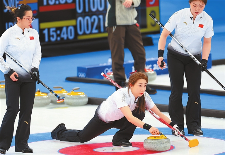 China’s Zhang Lijun (C) in action against Denmark during their team curling game in the National Aquatics Center in Beijing on Thursday. Denmark beat China 7-6. Xinhua