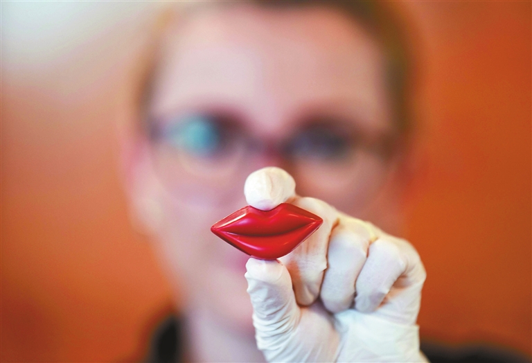 A woman displays a mouth-shaped chocolate at a chocolate factory in Kosovo on Saturday. Chocolates are a winning gift for Valentine’s Day, which falls on today.SD-Agencies