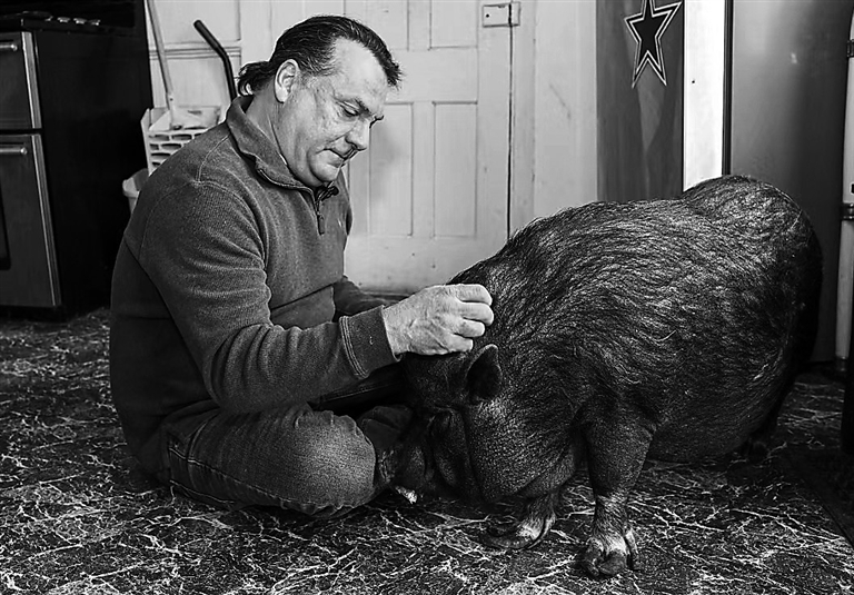 ELLIE the potbellied pig snuggles up to Wyverne Flatt when he watches TV and sometimes rolls over to let him pet her belly. The 110-pound pig is “family,” Flatt says, an emotional support animal who helped him through a divorce and the death of his mother.