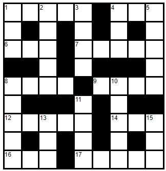 Across 1. 1st, 2nd, 3rd, and home 4. Price for service 6. Hot drink 7. Not before 8. Not real 9. Equitable 12. Paris tower 14. Not high 16. Not him 17. Tall building Down 1. Flying rodent 2. Slap on the bottom 3. Trade; barter 4. Very overweight 5. Mistake 8. Not stale 10. Permit 11. Not bumpy 13. Type of evergreen tree 15. Military conflict |