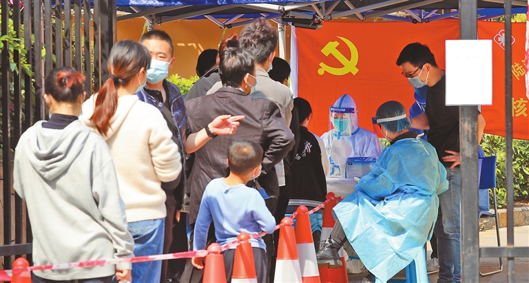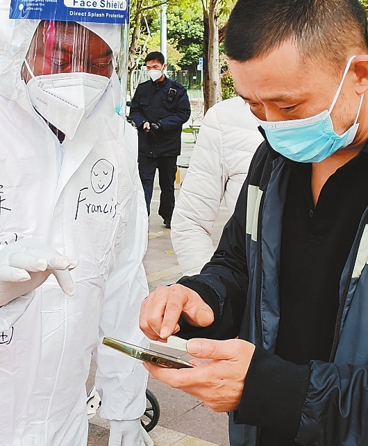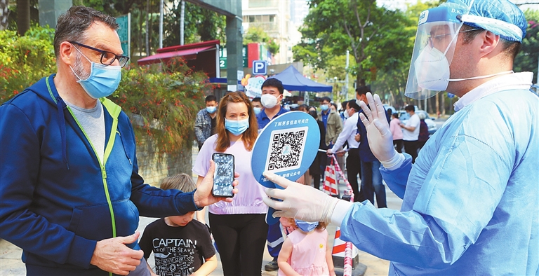 Yang Mei yangmei_szdaily@163.com NUMEROUS medical staff, community workers, Chinese and international volunteers across Shenzhen have joined the task forces to help the city combat the latest wave of the COVID-19 pandemic. Clad in white and blue protective suits or wearing red vests, they are seen busily working at nucleic acid testing sites and residential compounds to help residents scan the QR codes for testing, maintain good order to make sure that everyone follows health protocols properly, deliver groceries and daily necessities to those restricted to their homes, and so forth. According to Nanshan International Cultural Exchange & Service Center (NSIC), a team of over 70 Chinese and international volunteers has been formed in Zhaoshang Subdistrict of Nanshan District, including residents from China, the United States, Mexico, Belgium and India. Shekou Subdistrict and Zhaoshang Subdistrict in Nanshan, Shenzhen’s two largest expatriate communities, are designated as prevention areas. Shortly after several COVID cases were reported in Nanshan, NSIC created a WeChat group to recruit volunteers and has seen active sign-ups. Volunteers are required to present 24-hour negative nucleic acid test results. |