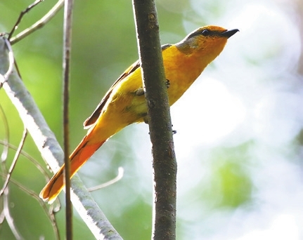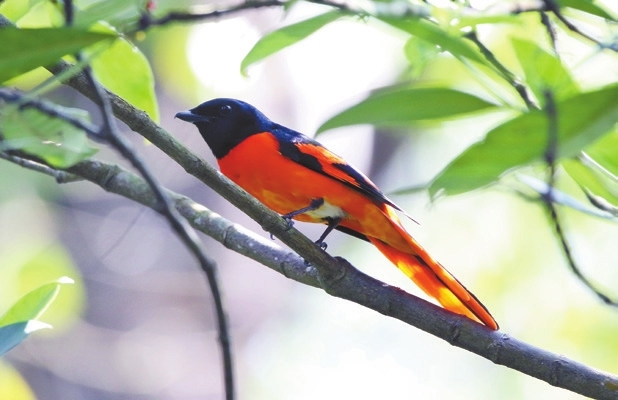 P robably the most colorful resident bird in Shenzhen, the scarlet minivet (pericrocotus speciosus) is definitely a work of art with the power to produce awe in every single spectator who has the privilege of observing them. Up to 22cm long, the scarlet minivets are characterized by having a strong sexual dimorphism: The males have a jet black cap covering their entire head, while the female’s is grayish but does not cover the face. The wings in males are black with scarlet patches while in females they are gray with black tips and yellow patches. The body is of a striking reddish-orange coloration in males and yellow in females and the latter also has a characteristic gray patch crossing their eyes. These fascinating animals often fly in groups and move in the top of the trees foraging for insects in the intricate branches where they aren’t easy to spot in spite of their delightful distinctive song that exposes their location. Scarlet minivets stay with only one partner and have their breeding season between the spring and summer months when they can lay up to four eggs that are incubated by the female alone while the male takes charge of bringing the precious food to the newborns for the following three weeks. Despite the fact that this species is not endangered, minivet numbers are decreasing year after year and it is our responsibility to prevent them from disappearing. 2022.3.3 A male scarlet minivet perches on a tree at Wutong Mountain in Shenzhen. |