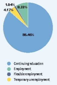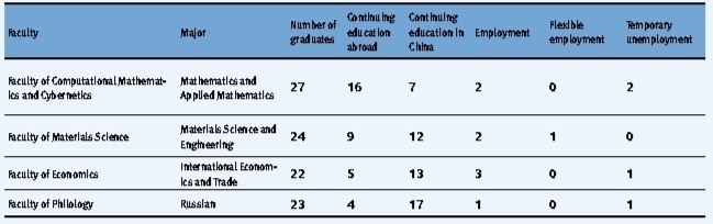 As of Feb. 21, 2022, the career outcomes rate for the Class of 2021 is 95.83%, with 83 (86.46%) reporting continuing education, eight (8.33%) reporting signing an employment contract, one (1.04%) reporting flexible employment, and four (4.17%) reporting temporary unemployment. In terms of majors, the career outcomes rate for college graduates from the Faculty of Computational Mathematics and Cybernetics is 92.59%. The rates for those of the Faculty of Materials Science, the Faculty of Economics, and the Faculty of Philology are 100%, 95.45% and 95.65%, respectively. |