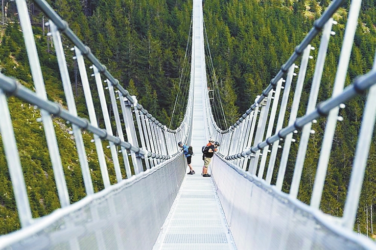 A PEDESTRIAN suspension bridge that is the longest such construction in the world has opened at a mountain resort in the Czech Republic. The 721-meter-long bridge is built at an altitude of more than 1,100 meters above sea level. It connects two ridges of the mountains and hangs up to 95 meters above the valley below. Sky Bridge 721, as it is known, is located in the northeastern part of the country in the Kralicky Sneznik mountain range near the border with Poland, some 200 kilometers east of Prague. The bridge offers unusual views for visitors who have a head for heights. Up to 500 people will be allowed to be on the bridge at any one time, although that number is halved for the first two weeks following Friday’s opening. The bridge will be closed for safety reasons if winds reach 135 kilometers per hour. The construction took two years and cost some 200 million Czech crowns (US$8.3 million). Critics say the bridge is too big for the surrounding environment, while others argue it will attract too many tourists to the town, which has a population of less than 500. Czech Tourism believes the bridge could attract tourists from all around the globe. Theo Scheepens, 59, from the Netherlands was one of the first. “Marvelous, impressive, the bridge moves, so you think something is going to happen,” he said. “I wonder what is going to happen when it is windy. It is terrific weather; we are very blessed.” The previous longest such bridge is in Arouca, Portugal, and measures 516 meters long.(SD-Agencies) |