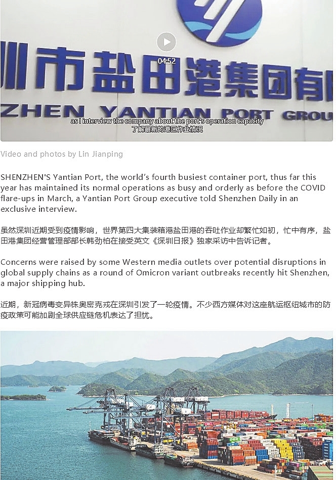 flare-ups 2022-04-13 Shenzhen’s Yantian Port, the world’s fourth busiest container port, thus far this year has maintained its normal operations as busy and orderly as before the COVID flare-ups in March, a Yantian Port Group executive told Shenzhen Daily in an exclusive interview. Concerns were raised by some Western media outlets over potential disruptions in global supply chains as a round of Omicron variant outbreaks hit Shenzhen, a major shipping hub, and sent parts of the city into lockdowns. Yantian Port Group’s Yantian Port and Dachanwan Port handled 3.59 million TEUs in the first quarter of the year. “The quarterly data declined slightly year on year, yet it still stays at historically high levels,” said Han Jinbai, director of the Department of Business Management of the company. |