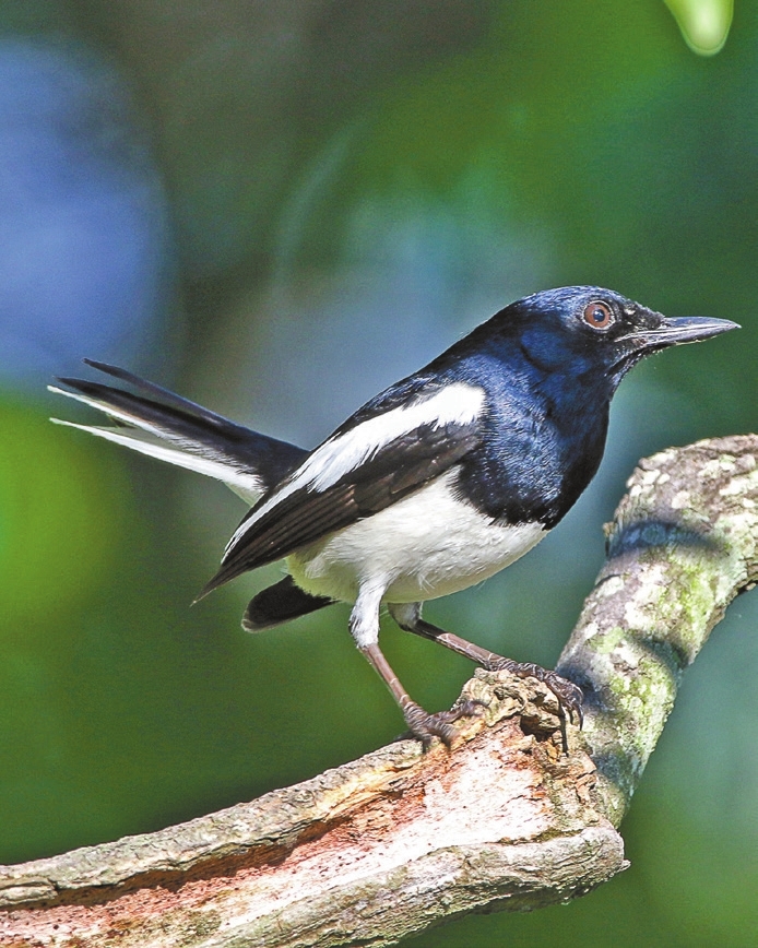 Probably one of the most conspicuous bird in Shenzhen, present in basically every corner of the city, the oriental magpie robin (Copsychus saularis) is a total delight to observe. This bird with its particular combination of black and white colors, is not an exclusive of parks or mountains but is easy to find in the streets and neighborhoods of the city. With a length of about 20 centimeters, males are of a bright black color on the top of their bodies and in the front under half of the chest, with a white underbelly and a white line of feathers crossing the wings. Females are of a lighter grey tone but keep the same black wings. The tail of the bird is relatively large and it is another way of differentiating males from females, as the latter have shorter ones. The magpie robin feeds on a variety of invertebrate animals including insects, arachnids, mollusks, crustaceans and even annelids like earthworms but can also be seen feeding on nectar, fruit and seeds from certain trees. One of the most fascinating traits about this species is their beautiful vocal behavior. You can hear a wide variety of sounds coming from them. There are even reports of them trying to imitate other bird species. They breed during the spring months, when females lay up to five eggs per clutch in nests that may be reused for another clutch. Newborns may hatch after a short two-week period and will be ready to leave the nest after another two weeks on average. Although this beautiful bird is not considered to be a threatened species, it is still important to protect them, so that we can enjoy a healthy diversified environment in our beautiful city. 2021.05.15 A male oriental magpie robin is seen in a park in Shenzhen. |