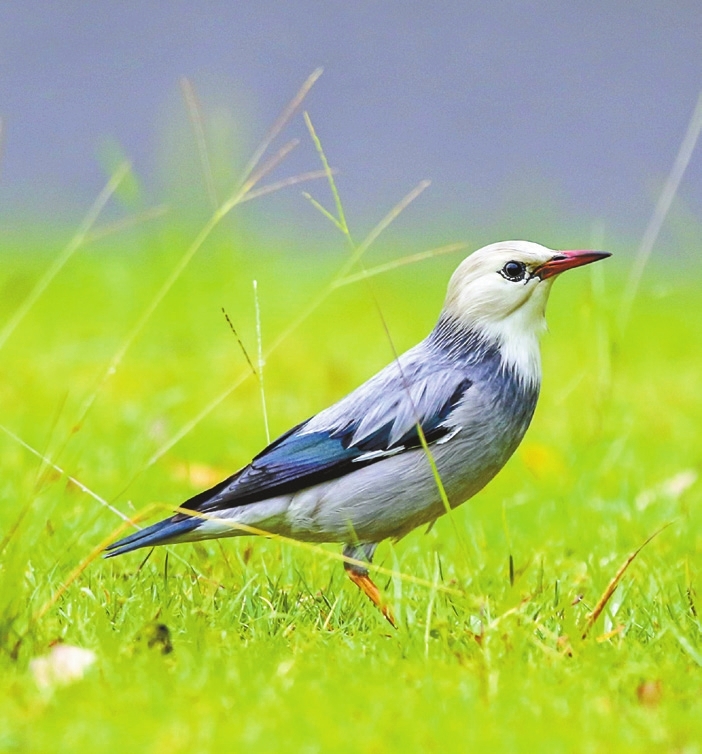 Measuring around 23 centimeters in length, the red-billed starling (Spodiopsar sericeus) is an astonishing bird that over time gradually started inhabiting our beautiful city. It is now considered a resident species in Shenzhen. Sexual dimorphism, which is common in birds, is also observed in this medium-sized starling. The males have a strikingly white head and a dark gray collar that diffuses into a lighter gray covering the rest of the body. Only the wings and the tail are of a fascinating bluish or purplish color that shines under the sunlight, a total delight to observe. The beak, as its name suggests, is red and in some instances may have a black tip; the legs are yellow or orange. Females are a bit brownish and the contrast between the head and the body is not as marked as it is in males. This species is often seen moving in large flocks and likes foraging in fields of grass in search of insects and worms, but also feeds on fruits from some trees. Despite their huge global population, its numbers in Shenzhen are pretty low. Their local population is in a process of initial growth, and the species calls for our protection of their habitats and food sources. This is a great opportunity to show our love for nature and to help with building a home for a new species in Shenzhen. 2022.05.27 A red-billed starling is seen foraging in Xiangmi Park in Futian District. |