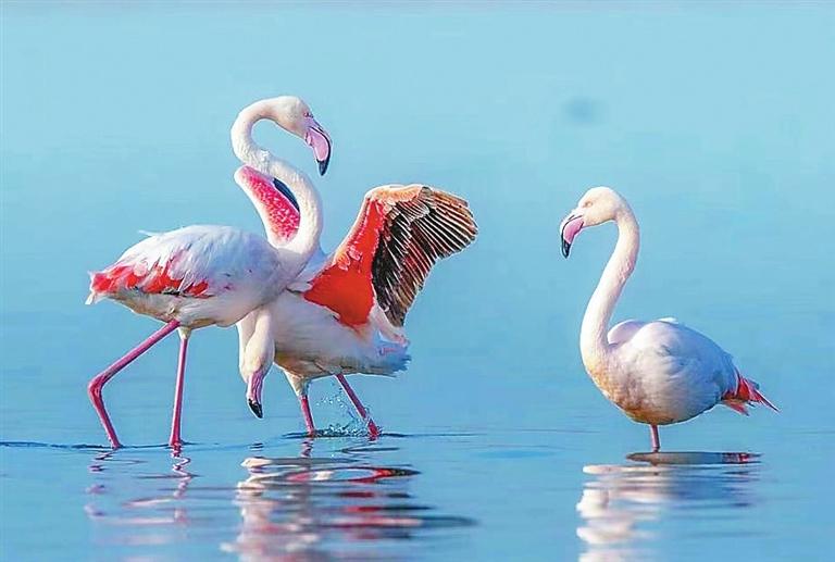SOMETIMES walking leisurely on the lake, sometimes playing with one another, three flamingos in pink and reddish plumage have attracted dozens of shutterbugs in camouflage coats to a feathery photo shoot at a salt lake in North China’s Shanxi Province. After two days, Li Zhongyou was finally satisfied with a photo of two flamingos cuddling up. In order to get the photo, he traveled more than 1,000 kilometers to the lake in suburban Yuncheng City. Wild flamingos mainly live on large, shallow water like pans and saline lakes in temperate and tropical zones and are found in Africa, Americas and the Mediterranean region, among others. No fixed habitat for the birds had been found in China before 2014. Zhang Weiping, one of the first people to take photos of flamingos in Yuncheng, recalled that in the summer of 2014, he was told that several unrecognizable birds had arrived at the salt lake, and only after arriving at the lake did he recognize them as flamingos. However, some of them had drooping wings, and some were sluggish and did not look in very good condition. “There were enough artemia, which is favored by the flamingos, in the lake, plus people’s protection efforts, so the birds gradually recovered after a few months,” said Zhang, who revealed that the improvement could be seen by looking at the color and brightness of feathers when the flamingos spread their wings. The recovered flamingos left the lake soon after, and it was thought that the “rare visitors” had just stopped by. However, a few months later another batch of flamingos was spotted. Since then, the salt lake has become a stopover site during the flamingos’ annual migration, with the total number of birds reaching as high as eight. Photos of the flamingos in the salt lake went viral online, attracting enthusiastic photographers from across the country. Meanwhile, these shy creatures no longer just remained in the middle of the lake, but started getting closer to people, sometimes moving to just a few dozen meters away from them. “Besides flamingos, another 100 species of wild birds can be spotted here, such as black storks and whooper swans, and the salt lake has become one of the must-visit places for bird photographers in the country,” Zhang said. The reasons why the flamingos first landed in Yuncheng are still unknown, but the significant improvement in the ecology of the lake, which was once a chemical production site, is undoubtedly an important one. The salt lake has seen human activities since ancient times, and its mining history can be traced back to 4,000 years ago. After the 1950s, the development of local chemical enterprises reached a peak, which damaged the surrounding environment of the lake. At one point, there were 15 work sections around the lake that were mining and manufacturing chemicals, with tall chimneys constantly releasing black smoke into the sky. Lyu Guoyu is a photographer who works for a salt lake ecological protection and development center. During his field research, he met many photographers, and under their influence, he fell in love with bird photography. “Talking to them gave me a deeper understanding of ecological protection, which helped make our work more target-oriented,” Lyu said. To better protect the ecology of this salt lake, industrial production activities around the lake were completely terminated in 2020, and restoration work on mountains, forests, and lakes was also carried out. “Birds are the ‘elves’ of the salt lake, and photos can help more people know them, thus calling on everyone to protect our environment,” Lyu said.(Xinhua) |