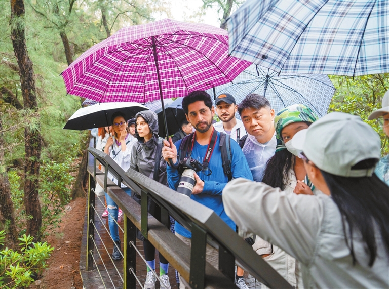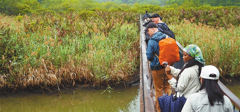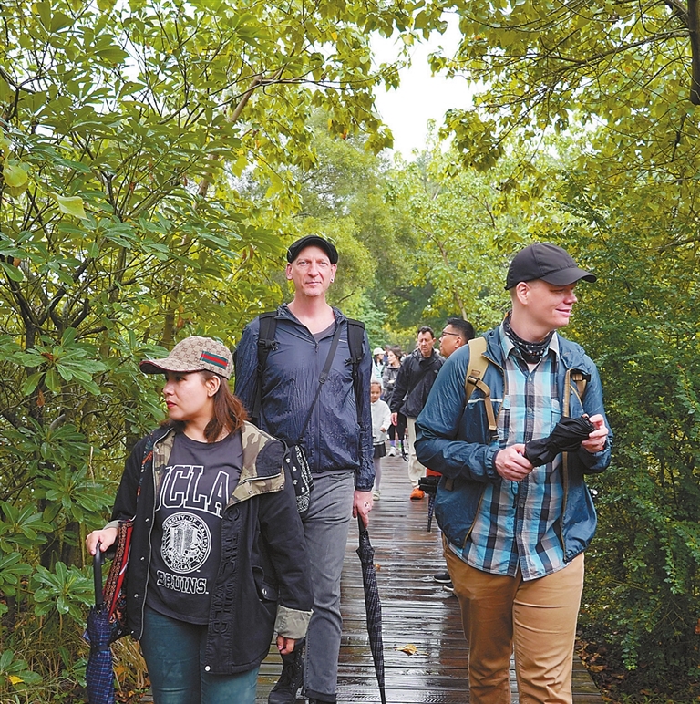 Yang Mei yangmei_szdaily@163.com ON a drizzling Sunday afternoon, a group of about 20 expat photographers and nature enthusiasts from 12 countries briefly escaped the urban jungle and embarked on a trip to an urban oasis — Futian Mangrove National Nature Reserve, located in the northeast part of Shenzhen Bay. The event was organized by EYESHENZHEN.COM and Shenzhen Daily, and supported by the Guangdong Neilingding Futian National Nature Reserve Administration. Guided by Dr. Yang Qiong, professor of engineering at the Guangdong Neilingding Futian National Nature Reserve Administration, the group, consisting of expats from the U.S., the U.K., Russia, Australia, Singapore, Malaysia, Japan, the Czech Republic, Italy, the Philippines, Bolivia, and Pakistan, walked through the dense mangrove forests. They stopped at several points to learn about mangroves, and admire and capture the beauty of the unique ecosystem with their cameras. Yang explained to the visitors the history of the nature reserve and the importance of mangroves to the coastal ecosystem. She also highlighted the need for conservation and restoration efforts to protect mangrove forests from human activities such as logging and fishing. Yang also pointed out various bird species that call the reserve home. Along the way, the expats used a telescope to watch a flock of birds preening and foraging in gei wai (excavated ponds used for shrimp and fish farming), including common redshanks, dunlins, common moorhens, little egrets and grey herons. Via a real-time video monitoring system at a bird-watching pavilion, the sightseers spotted black-faced spoonbills perching on the branches of the mangroves. Soon afterwards on their way back, they encountered and were wowed by a great egret flying over the lush mangrove forests, and some of them quickly raised their cameras, attempting to snap shots of the elegant, dazzling white bird. For Teo Wei Tiong, a Singaporean who has been living in Shenzhen for almost 20 years, the trip was an educational, refreshing and enjoyable experience. “The trip is very educational because it’s like having some new lessons for us. At the same time, it’s refreshing with the rain, and we see a lot of green, so it’s also enjoyable,” he said. Teo said he also gained a newfound perspective of different species of mangroves and the preservation efforts of the government and the reserve. Husnain Raza, a postdoctoral research fellow at Shenzhen University’s Institute for Advanced Study, who studies food science and engineering, said he was “shocked” to see a nature reserve in the center of the city, adding that he was inspired by what he had learned about the mangroves for his research. (Continued on P2; More photos on P3) (From Page 1) “I’m working on rice starch. We know rice is one of the reasons for diabetes because it is readily digested and can raise blood sugar. So, I’m wondering that maybe we could extract the starch of tannins from mangroves to make some product to reduce digestion,” Raza explained. Enza Migliore, an assistant professor from the School of Design at Southern University of Science and Technology (SUSTech), told Shenzhen Daily that she was very impressed about the tranquility and the quality of air in the reserve. “It’s very impressive that in the middle of the crowded technological city, we have such a quiet place where you can really breathe the fresh air and admire the beauty of the mangroves,” Migliore said. The Italian said she appreciates the city government’s efforts to shift from a human-centered development approach towards urban nature spaces to prioritize the protection of birds. Migliore suggests that the reserve could improve the design of its facilities such as the manmade walking trails to make people a part of nature instead of being an obvious observer. Spanning about 9 kilometers along the coastline with a total area of 367.6 hectares, the nature reserve is the smallest mangrove reserve in China and the only national nature reserve in urban areas in China. According to the reserve’s official website, the reserve is home to a diverse range of flora and fauna, including 16 native mangrove species, which are an essential part of the coastal ecosystem. The reserve also serves as a wintering site and stopover for nearly 100,000 migratory birds every year. On Feb. 2, the Futian Mangrove National Nature Reserve was recognized as a Wetland of International Importance under the Ramsar Convention. The Shenzhen Municipal Public Works Bureau recently released an open tendering for the design of the exhibition part of the Shenzhen Mangrove Wetland Museum. The national-level museum will be located at the junction of Shenzhen Bay coastal reclamation zone and the corridor featuring both mountains and seas, and is close to major urban facilities and areas such as the mangrove nature reserve, Shenzhen Bay Park, Shenzhen International Garden and Flower Expo Park and the Futian integrated transportation hub. China proposed establishing an international mangrove center in Shenzhen as an important site for global mangrove preservation and cooperation on Nov. 5 last year. A draft resolution in this regard was officially passed at the 14th Meeting of the Conference of the Contracting Parties to the Ramsar Convention on Wetlands (COP14) on Nov. 13, 2022. |