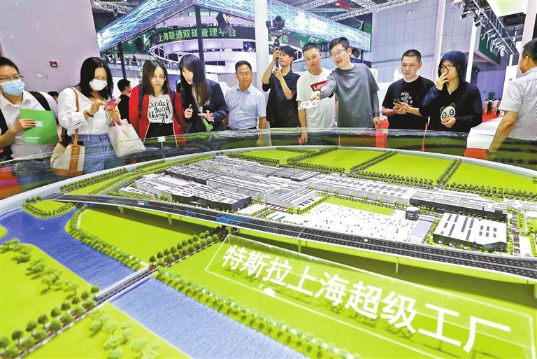 Visitors look at a model of Tesla’s Shanghai factory at the Shanghai Carbon Neutrality Expo, which opened Sunday. The first of its kind in China, the expo represents China’s response to climate change and brings an international stage for green technologies and applications. More than 600 exhibitors, including Arup, Baowu Steel, State Grid, Schneider Electric and Tesla are attending the four-day event, showcasing applications and innovation in various sectors like transportation, industrial design and finance. Xinhua |