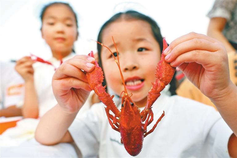 A child displays a crayfish during the 23rd International Crayfish Festival in Xuyi, East China’s Jiangsu Province, on Tuesday. Xuyi County, a major crayfish base, has a crayfish farming area of more than 60,000 hectares, yielding an output value of 20.2 billion yuan (US$2.82 billion) in 2022. China News Service |