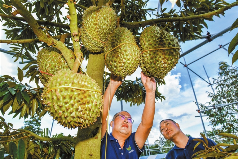 HAINAN Province is anticipating its first durian harvest this summer after years of cultivation. A durian plantation in the Sanya Yucai Ecological Zone has yielded its first fruit on a large scale, with the crop expected to be ready for market soon. “Due to lower temperatures in Hainan this year, the maturity of the fruit originally expected to hit the markets in May or June has been delayed to the end of June or early July,” said Du Baizhong, general manager of Hainan Youqi Agricultural Co., adding that the company’s planting base in the zone is expected to produce a maximum of 50,000 kilograms of durian this year. According to the Sanya bureau of agriculture and rural affairs, the city began planting durian four years ago. The trees began bearing fruit on a large scale this year. Sanya has planted more than 660 hectares of durian in various districts, and more of the fruit is expected to enter the market. Du’s company is the city’s largest durian producer in terms of planting scale. He said that in 2019, when 44 durian trees that were introduced to the Baoting Li and Miao Autonomous County as part of afforestation efforts successfully bore fruit, he was inspired to cultivate the tropical crop. He sent workers to Southeast Asia to learn how to grow the spiky fruit, and established a scientific and research cooperative with the Chinese Academy of Tropical Agricultural Sciences. The company also recruited workers with master’s degrees in agriculture. By working with scientific research institutes and being guided by Southeast Asian-Chinese agricultural specialists, the company began to plant durian in the ecological zone in March 2020. With advanced technology and equipment, the base can automate water distribution, fertilizer management, meteorological monitoring and pest control. The company now has durian plantations in the ecological zone, as well as in Ledong Li Autonomous County and Baoting Li and Miao Autonomous County. “In Hainan, the cultivation of the delicate durian fruit requires more manual interventions and greater attention to their growth rate, compared with that in Southeast Asia,” Du said. “We upgraded our irrigation three times based on the terrain in our base. Now, with intelligent sensors, we can easily conduct analysis on the water supply of the durian crops.” Hainan sought to grow durian back in the 1950s. At first, the province planted seeds directly, but with this method the trees took more than 10 years to bear fruit. Now, by taking a branch from a tree that is already bearing fruit and grafting it onto one that is growing, farmers can yield fruit within three years. “With the support of the provincial government and the ecological zone, we have introduced durian crop varieties from Southeast Asian countries such as Laos for study and research,” Du said. Last year, a few trees in the base had already borne ripe fruit, he said. “Anyone standing 6 or 7 meters away could smell their aroma.” Durian, which is popular among consumers in first-tier cities, is one of the top imported fruits in China. The successful cultivation of the tropical fruit in Hainan means that durian lovers in China can enjoy the fresh, local variety, which tends to be sweeter than its foreign counterparts, according to the bureau.(China Daily) |