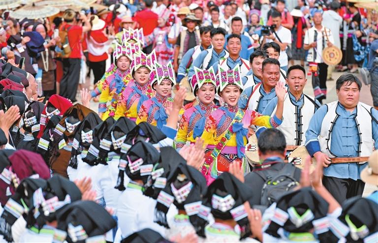Ethnic minority people perform during the Hualian Festival, or Painted Face Festival, in Qiubei County, Wenshan Miao and Yi Autonomous Prefecture, Yunan Province, yesterday. The Hualian Festival is a traditional festival in Qiubei County where people express best wishes by daubing black rice ash on face to get good luck. China News Service |