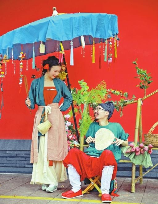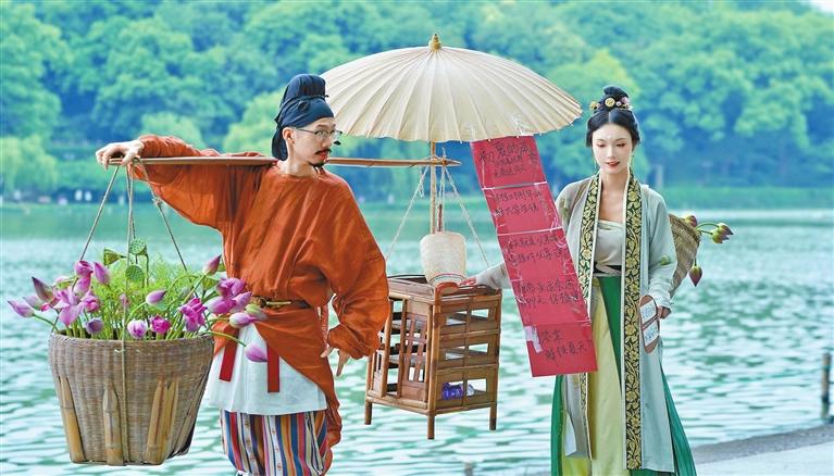 A NEW enchanting attraction has emerged along the banks of West Lake in Hangzhou, Zhejiang Province. There, a man and a woman dressed in exquisite traditional garments, seemingly transported from ancient China, graciously offer flowers free of charge, presenting a captivating glimpse into the past.