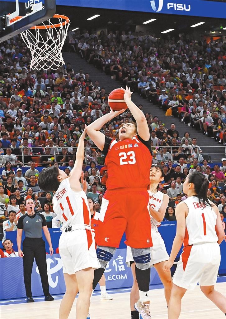 China’s Liu Yutong (No. 23) goes up for the basket against Japan during their women’s final at the 31st FISU Summer World University Games in Chengdu, Southwest China’s Sichuan Province, on Saturday. In this eye-catching final, China beat Japan 99-91 for its third crown of the kind. China News Service |