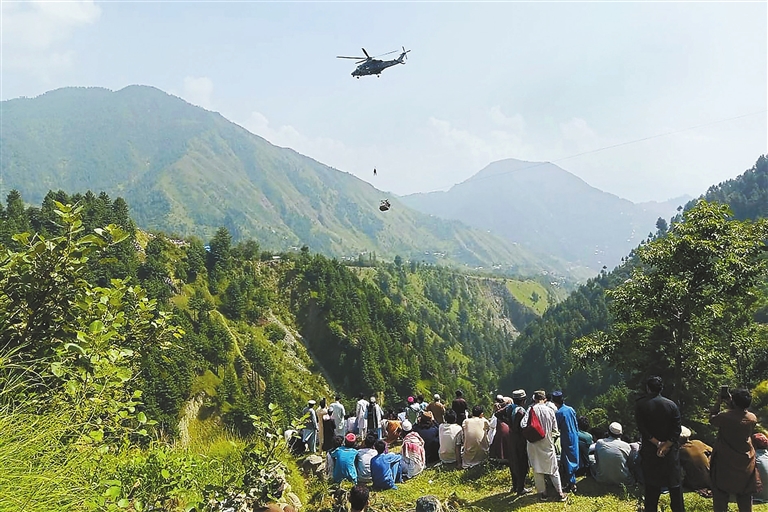 People watch as a military helicopter is in the midst of a rescue operation that lifted eight people from a stranded cable car in northwest Pakistan on Tuesday. After a 14-hour ordeal, all eight people, including six children and two adults, who were stranded on a cable car dangling hundreds of meters over a valley in northwest Pakistan have been rescued, the country’s caretaker Prime Minister Anwaar ul Haq Kakar said in a statement. The rescue began Tuesday morning local time after six children and two teachers were traveling to school in the province of Khyber Pakhtunkhwa when one of the gondola’s cables snapped, leaving them stuck some 300 meters above a valley, officials said. |