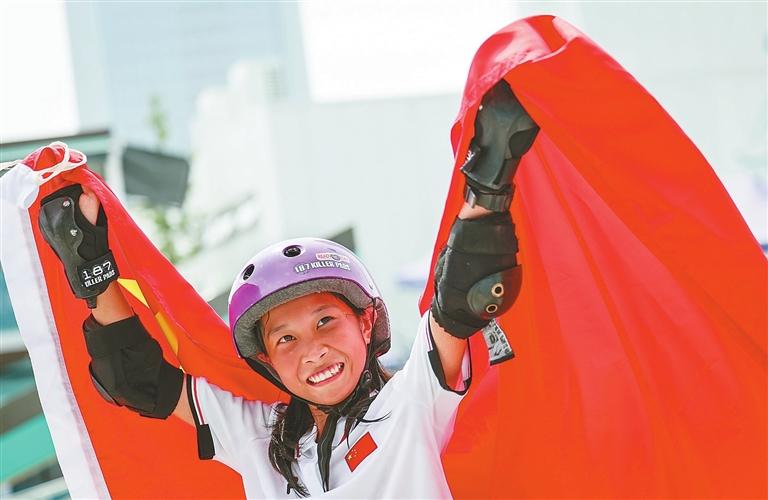 China’s 13-year-old Cui Chenxi celebrates after claiming the title of the Women’s Street Final of Skateboarding at the 19th Asian Games in Hangzhou, East China’s Zhejiang Province, yesterday. Cui became the youngest Chinese player to win a gold at Asian Games. Xinhua |