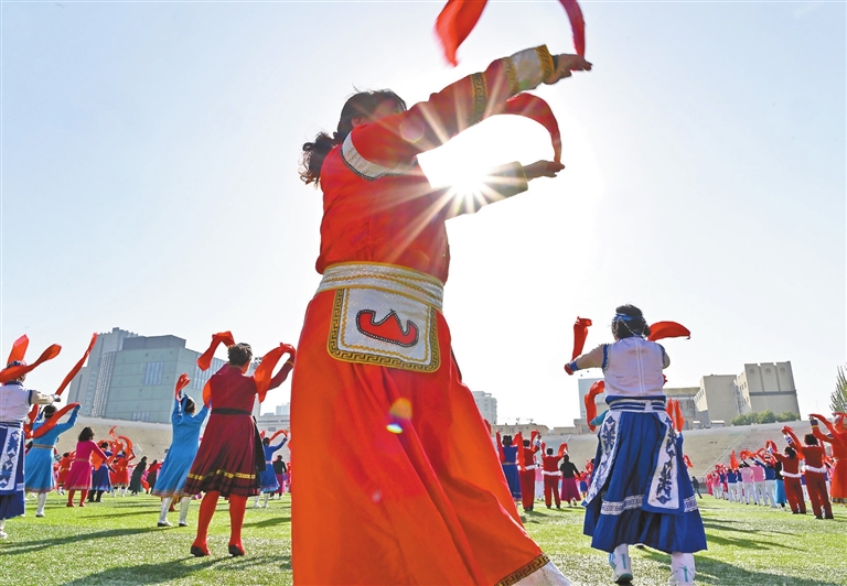 People perform Andai dance in Hohhot, Inner Mongolia, yesterday in an event to promote traditional culture. The Andai dance is one of China’s national intangible cultural heritages, and is known as the “living fossil of Mongolian dance.” China News Service |