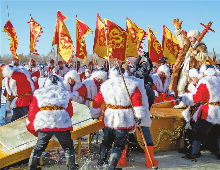 Workers harvest the first ice block during a ceremony to mark the start of the ice harvest season on the frozen Songhua River in Harbin, Heilongjiang Province, on Thursday. Xinhua