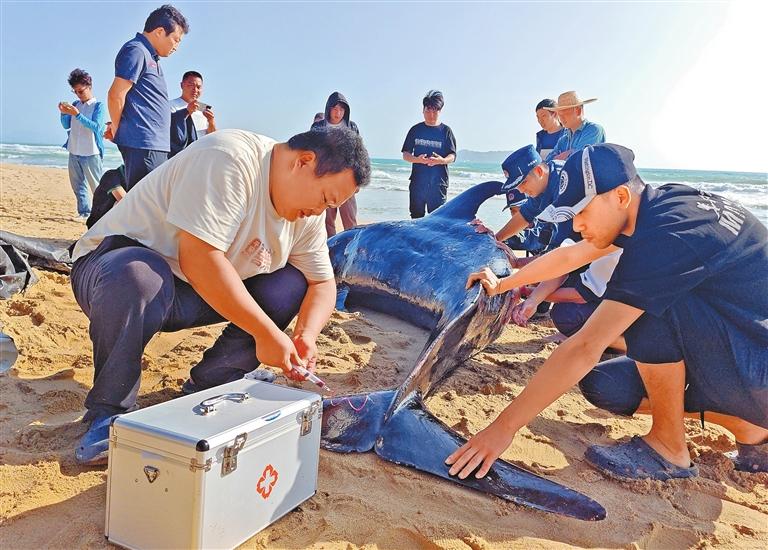 Volunteers treat an injured whale after it was found stranded near the coastline of Haitang South Road in Sanya, South China’s Hainan Province, on Wednesday. The whale has been sent to the Sanya Haichang Wildlife Conservation Center for further treatment.