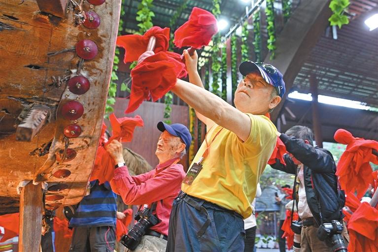 Photographers from Chinese mainland and Taiwan experience the Jinuo drum dance in Jinghong, Yunnan Province, on Sunday. The drum dance was included in the first batch of national intangible cultural heritage list in 2006. The event was part of a cross-Strait cultural exchange tour for photographers. China News Service |
