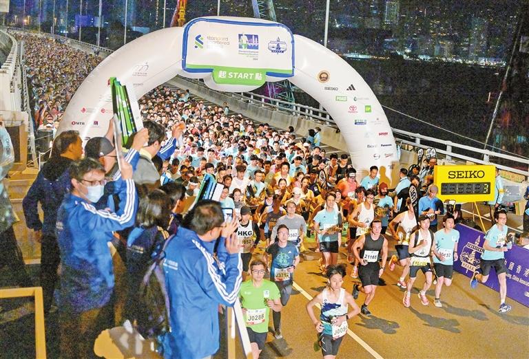 Players compete during the Hong Kong Marathon yesterday. About 74,000 runners participated in the marathon , an annual sports event with the highest participation rate in Hong Kong.China News Service