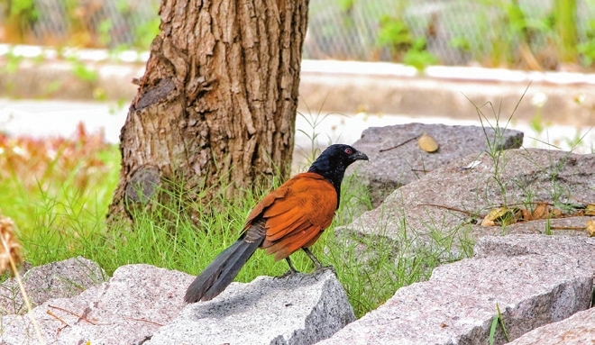 THE greater coucal (Centropus sinensis), found in many places in Shenzhen, is a large bird measuring around 60 centimeters long. It boasts a shiny dark blue plumage with a chestnut-brown wingspan and a long, prominent tail. Its eyes are red, contrasting with a dark blue face. It possesses a stout body, strong legs, and a sharp beak. It’s found in the city’s forests, woodlands, and marshes, and also near water bodies such as streams, rivers, and ponds. The greater coucal, which thrives in natural and human-altered landscapes, makes a common sight in Shenzhen’s gardens, parks, and even urban areas, where they delight bird lovers with its unique whoop-whoop call. The greater coucal is an omnivorous bird with a diverse diet. It feeds on insects, small mammals, birds, reptiles, and eggs. It is exceptionally skilled at catching such bigger insects as grasshoppers and crickets, using its swift movements and sharp beak. During their breeding season, the bird engages in fascinating courtship rituals. The male performs an elaborate display, spreading its wings and tail while making deep booming calls to attract a female. Once the pair bond is established, they build a large, untidy nest of twigs and leaves, usually hidden within dense vegetation. The female lays several eggs, and both parents take turns to incubate them. The parents then diligently care for their hatchlings, providing them food and protection until they leave the nest. The bird plays a crucial role in local ecosystems. As an insectivorous bird, it helps control the population of pests, small mammals, and reptiles. Moreover, the greater coucal plays a role in dispersing seeds, as it consumes various fruits and excretes the undigested seeds in different locations, promoting plant diversity and regeneration. However, this amazing bird is not easy to spot, due to its shy behavior and its tendency to hide within the vegetation. If you see it, or hear its call, feel fortunate, and enjoy the beauty of our unique biodiversity. |