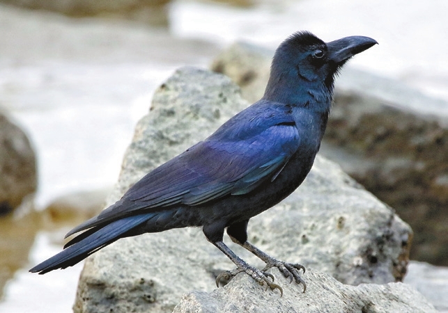 THE large-billed crow (Corvus macrorhynchos), with a glossy black plumage, has a robust body and a notably large bill, which sets it apart from other crow species. Measuring 50 centimeters long with a wingspan of around 1 meter, these birds are impressive as they glide through the skies of Shenzhen.