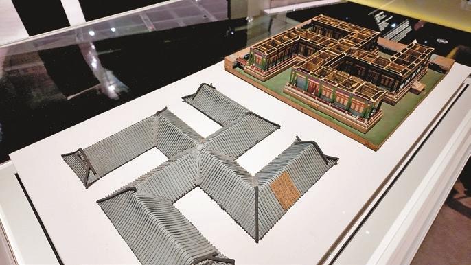 Highlighted exhibits for the first rotation include the “tangyang” (燙樣, meaning architectural models) of the Hall of Universal Peace and the Hall of Nine Continents in Peace in the garden-palace, whose facades both taking after the Buddhist swastika motif; “Consort of the Qianlong Emperor and Yongyan,” an silk affixed hanging probably painted by missionary Giuseppe Castiglione (1688-1766) and other court painters; the “Yongzheng Emperor Enjoying Flowers in the Peony Terrace” hanging scroll; the “Yinzhen sitting in the Pavilion of Recitation in a Clear Voice” hanging scroll; and architectural elements and shards unearthed from the Yuanmingyuan ruins in Beijing.