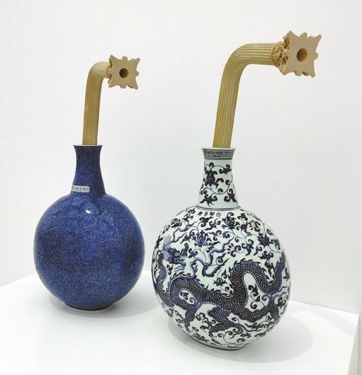 The “Beverage” series turns ancient Greek pillars into drinking straws, inserted into traditional Chinese blue-and-white bottles and vases and even into the iconic sculptures of the Farnese Hercules, the Fall of Icarus, and the Venus of Willendorf. These absurd and dramatic amalgamations of Eastern and Western symbols generate a visually arresting experience, symbolizing the complex interactions within civilizations.